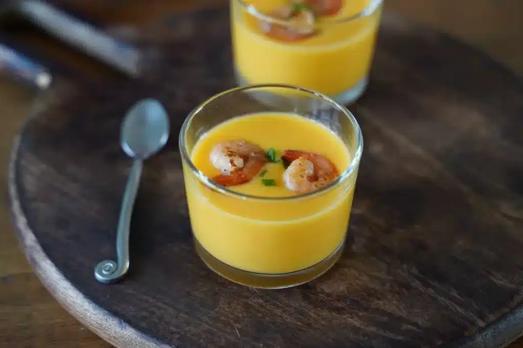 Verrine de potimarron et crevettes grillées : on part sur un velouté de potimarron surmonté de crevettes grillées. Ce velouté peut être préparé la veille. Il vous suffira de le réchauffer le jour même, au moment du service.