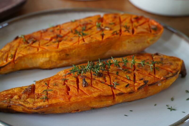 La meilleure façon de préparer et de cuire la patate douce est de la passer entière au four ou de la couper dans le sens de la longueur puis la disposer sur une plaque de cuisson garnie d’aluminium ou de papier cuisson. Un peu d’huile d’olive, du paprika, du thym, du sel, et c’est prêt !