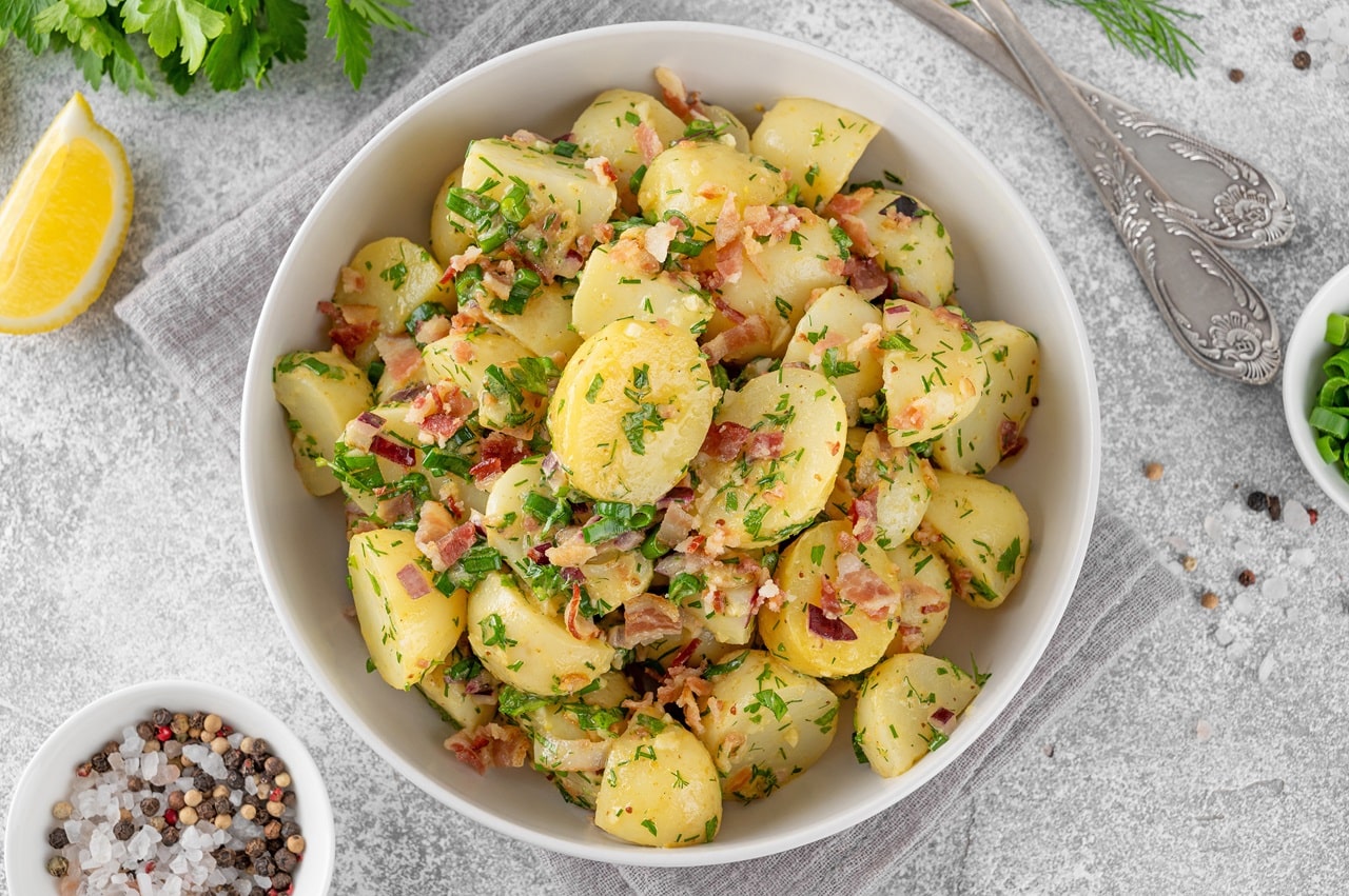 La salade de pommes de terre façon grand-mère est un grand classique, aussi appelée salade alsacienne. Elle se prépare avec peu d’ingrédients, composée de pommes de terre fondantes, mayonnaise, vinaigrette maison, bacon ou lardons dorés et persil frais : Servie froide ou légèrement tiède, elle accompagne bien les repas simples du quotidien. Découvrez la vraie salade de pommes de terre façon grand-mère, comme on la faisait autrefois. Une recette simple, facile et vraiment authentique.