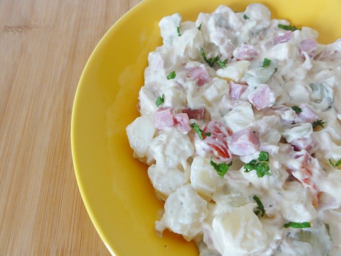 Voici une bonne salade piémontaise, une recette facile que nous adorons à la maison ! Dès qu’il fait chaud, les recettes de salade sont toujours au rendez-vous et ma préférence va pour la salade piémontaise au jambon avec comme ingrédients des cornichons, des pommes de terre, tomates, des Å“ufs et une sauce mayo maison bien-sur!