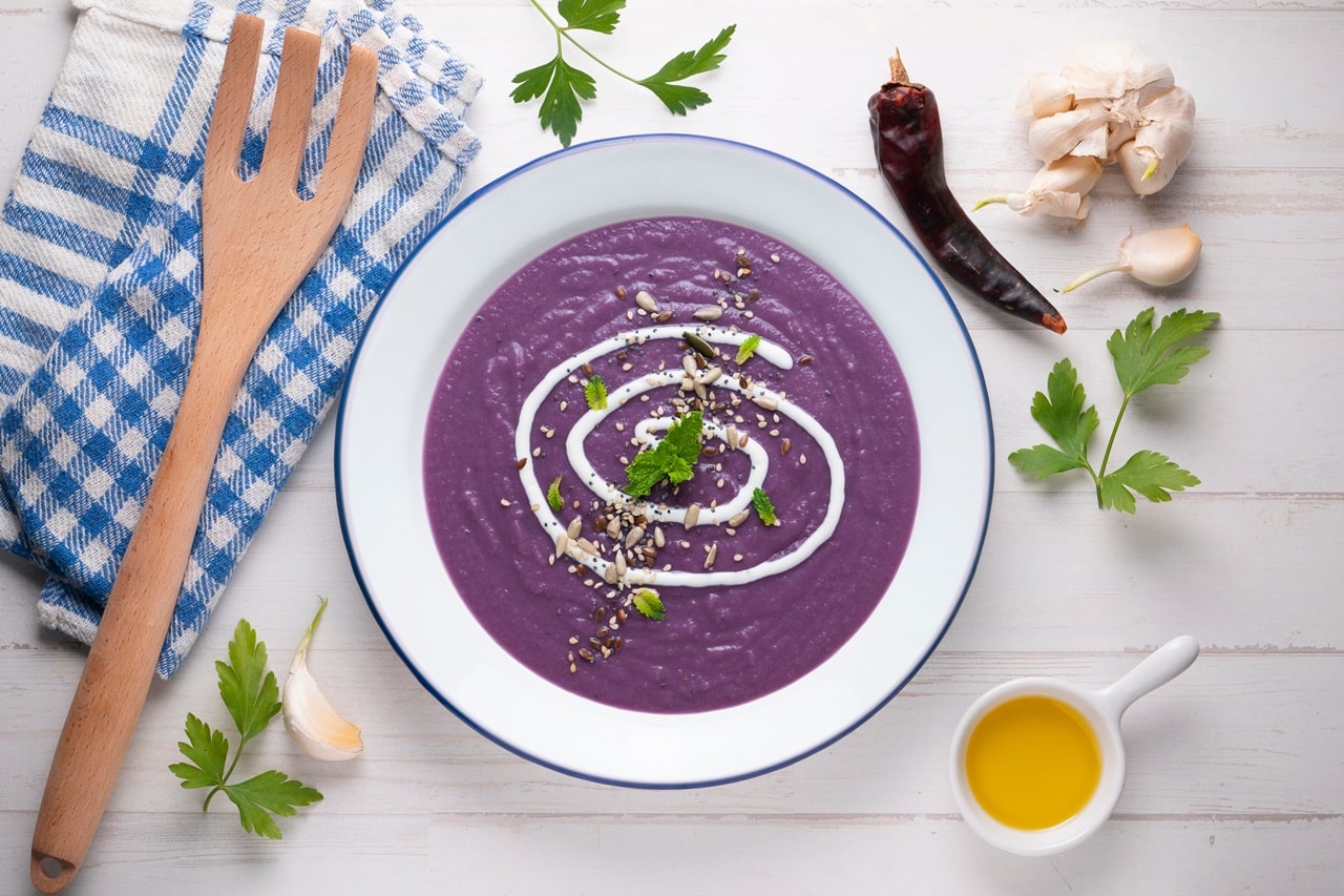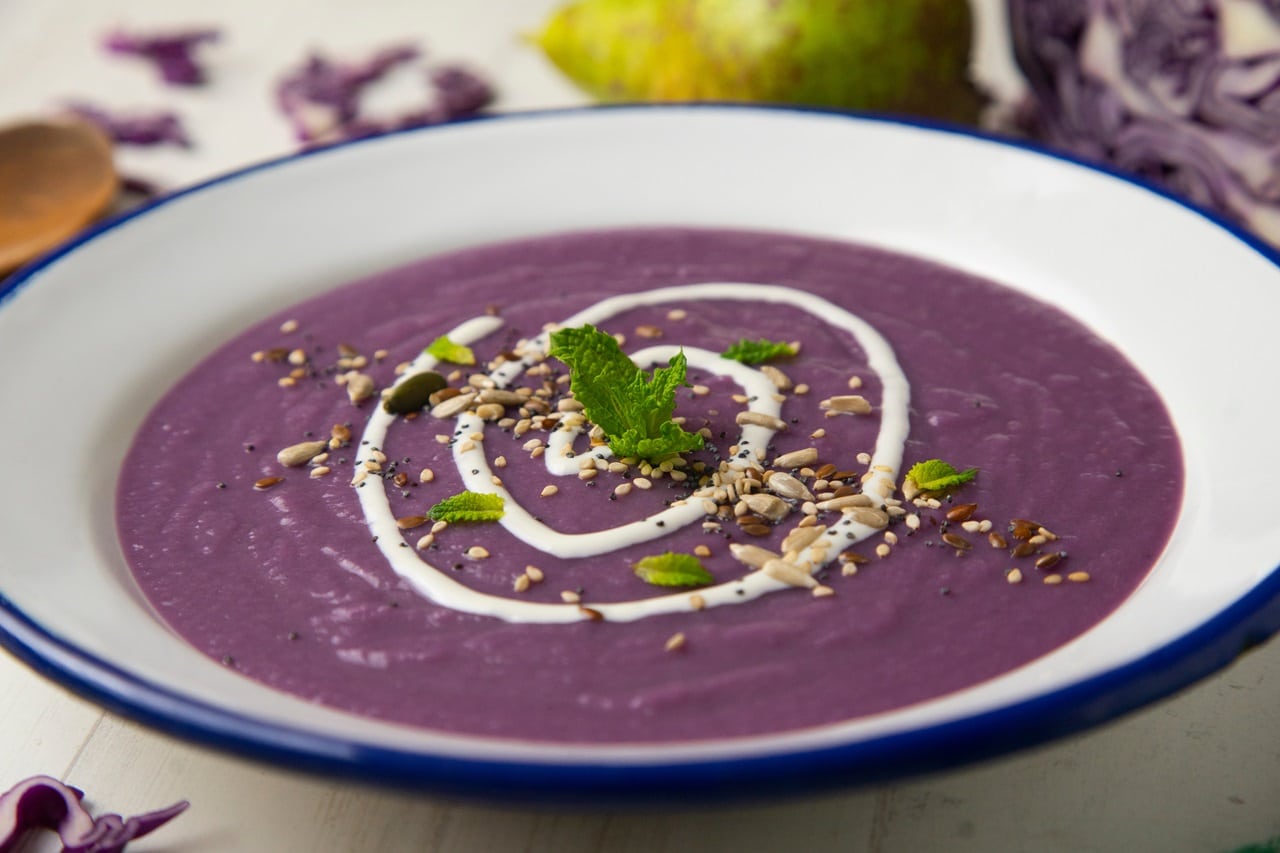 C’est normal : le chou coloré libère ses pigments naturels à la cuisson, ce qui donne cette soupe violette originale. Une fois mise au frigo, elle devient bleue.