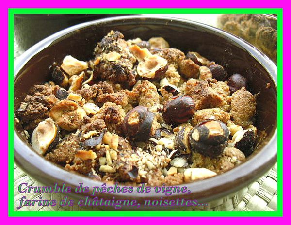 On passe maintenant à Isa du blog de cuisine Un brin de tulipe Isa qui a testé la recette crumble du chat qui tousse une version de crumble de pèches de vigne. Merci beaucoup Isa.